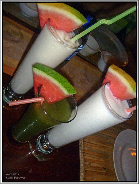 Before entering the resto, you should take off your foot wears and place it on a basket. The ambiance of Kalui was so relaxing and very impressive! It was made of woods, their floors are well-polished, very creative interior design, such as the fruit decorations and different art pieces. They also have mini gallery inside. I choose the table where you can sit in the cushion lay on the floor and near the entrance with a open view of their mini garden. (July 5, 2012)